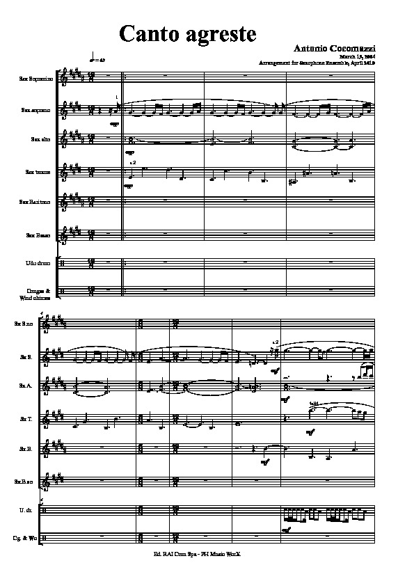 Versione (2010) per Ensemble di sassofoni (1SI, 2S, 3A, 3T, 2B, 1BS) e 2 Percussioniati (Udu drum e Congas & Wind chimes).